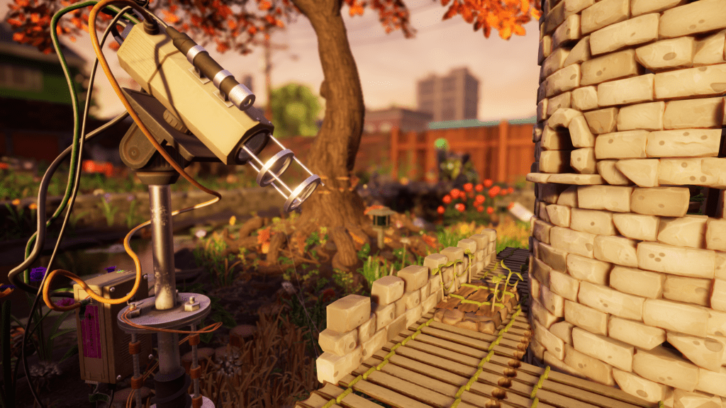 And the building itself is sublime. The building tools that Obsidian built for Grounded let anyone make something that looks cool. At the default difficulty level, the skip the kind of reality-based building that made Valheim a bit of a challenge in favor of building ludicrous towers supported only by a single block, or centimeters-long skybridges that make corpse runs simpler.